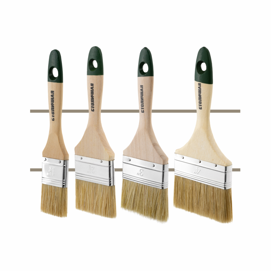Кисти плоские универсальные, ширина щетины 20–100 мм, толщина 10–12 мм, деревянная ручка, Столичная