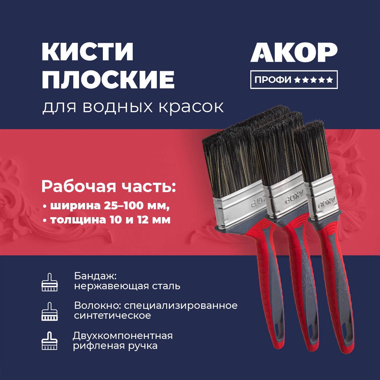 Малярные плоские кисти для водных красок серии «Профи».