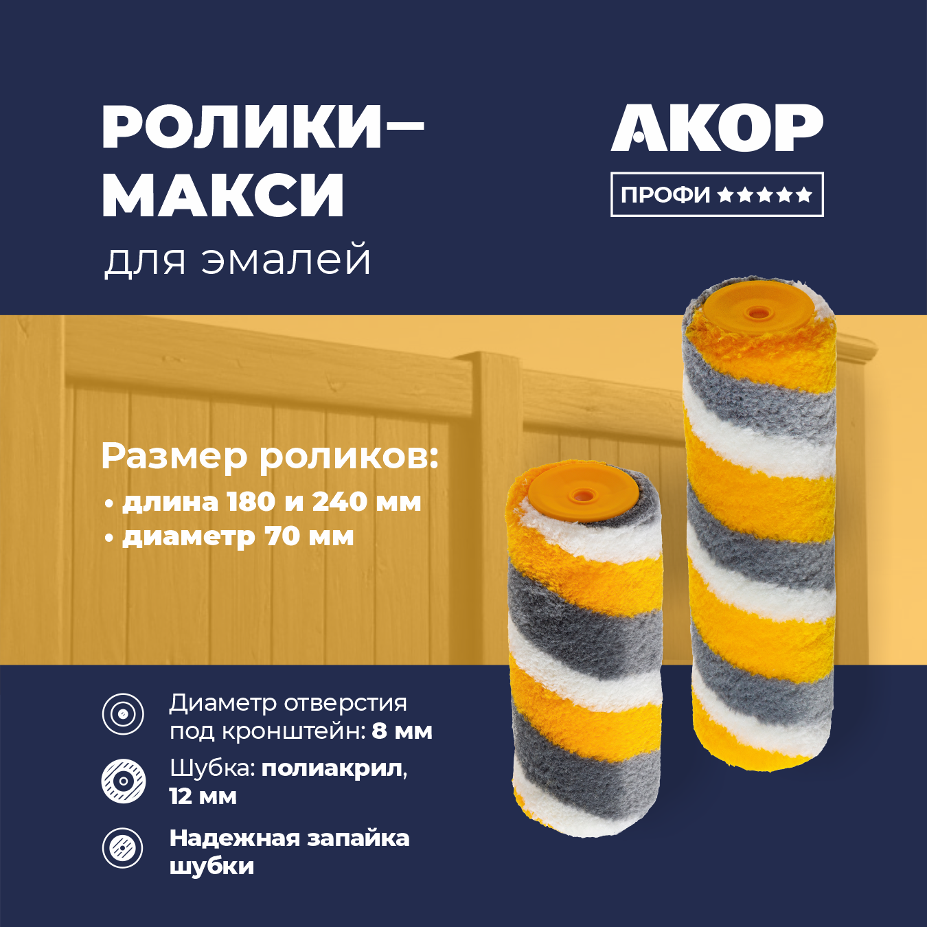 Текстиль роликов для эмалей серии «Профи» выполнен из объемного полиакрила высокой плотности. Изготовлен по технологии Thermofusion Coinjection. Быстросъемная система креплений с внутренней трубкой. Под бюгель 8 мм.